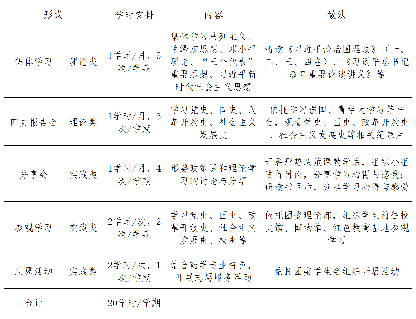 每周1学时,每月不少于3学时,每学期20学时,每学年40学时。