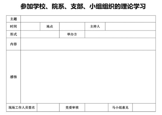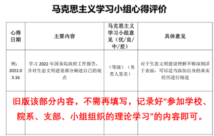 感悟:对学习内容的所思所想,可会后补充,不少于50字;无需另撰写电子版学习心得,也不需再填写“马克思主义学习小组心得评价”。“感悟”内容作为学习情况等级评定的主要依据。若入党发展对象参加学院组织的学习活动,活动观后感或者学习心得在学院官方微信公众号中发布,在有证明材料的支持下,等级评定直接为“优”;