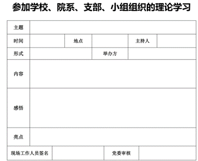 形式:支部党员大会学习议程,党日活动,座谈会,讨论会,电影院观影,支部组织观看影片,讲座,论坛,观看电视直播等。非必要不自行学习,自行学习一律将理论学时仅记为1学时;